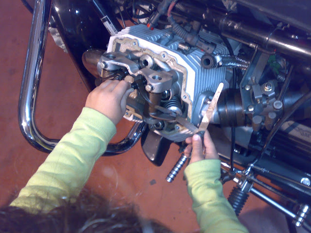 Metemos la galga de 0,10mm en la válvula de admisión y aproximamos con el tornillo de regulación hasta que la galga entre y salga rozando, aquí entra un poco el gusto del guzzista, los hay que nos gusta que roce bastante “apretá” y otros que roce poco “suelta”. Pero hay que tener cuidado una válvula “un poco suelta” hará más ruido y poco más, pero una válvula “demasiado apretá” puede ocasionar serios problemas en las válvulas y asientos.